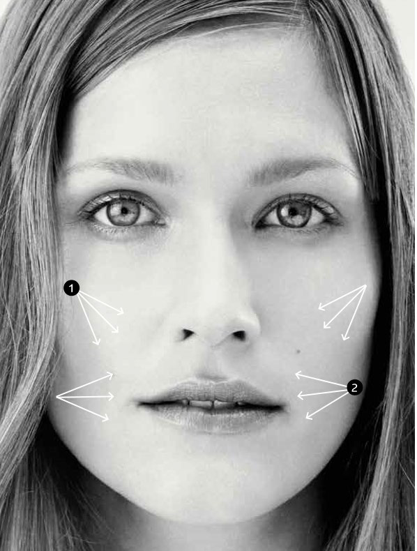 Τα πρώτα τρία σημεία είναι κατά μήκος των ζυγωματικών, για να επαναφέρουν τους χαμένους όγκους στο πρόσωπο και να ενισχύσουν το τρίγωνο της νεότητας.