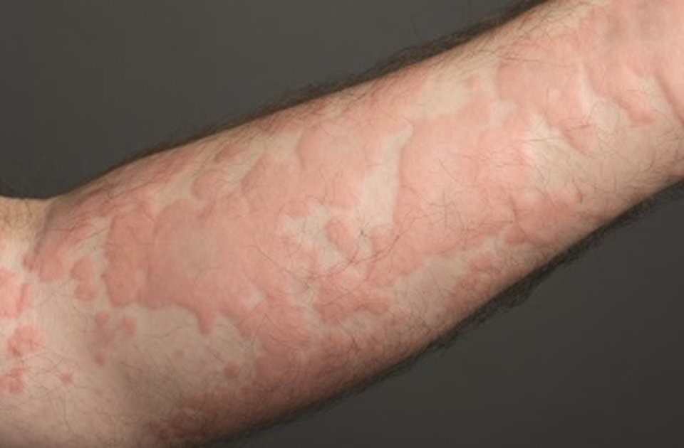 Πρόκειται για κατάσταση που χαρακτηρίζεται από την εμφάνιση ερυθρών πομφών με έντονο κνησμό. Μπορεί να εμφανισθούν οπουδήποτε στο σώμα και να συνδυάζεται με οίδημα στα χείλη και γύρω από τα μάτια. Την κατάσταση συνοδεύει έντονος κνησμός