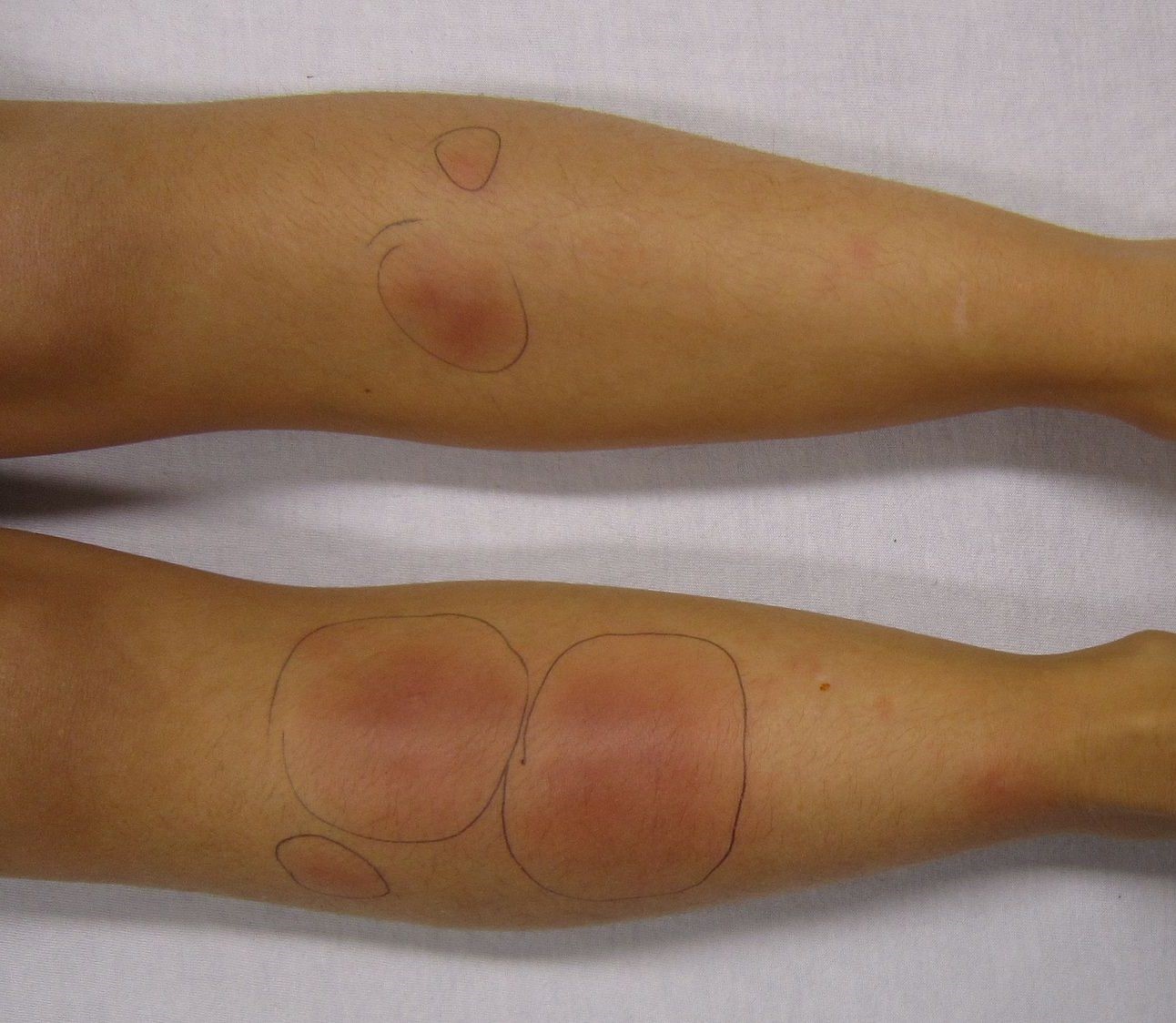 Η εμφάνιση είναι οξεία, με επώδυνα, ερυθρά οζίδια που εντοπίζονται στις κνήμες και συνδυάζονται με οίδημα αστραγάλων. Δυνατόν να προσβληθούν και οι μηροί καθώς και οι εκτατικές επιφάνειες των άνω άκρων. Μπορεί να έχουμε μεμονωμένες βλάβες διάρκειας μιας με δύο εβδομάδες ή εμφάνιση οζιδίων κατά ομάδες, διάρκειας μέχρι και έξι εβδομάδες. Μπορεί να συνυπάρχει κακουχία, πυρετός και αρθραλγίες.