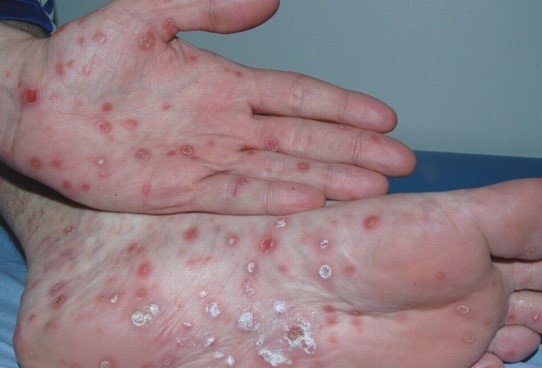 Σε περίπτωση που ο ασθενής δεν πάρει θεραπεία, η νόσος μπορεί να εμφανίσει μια υποχώρηση, αλλά να παρουσιαστεί δευτεροπαθής υποτροπή μέσα σε δύο χρόνια, που κυρίως προσβάλλει τα γεννητικά όργανα, τις παλάμες και τα πέλματα. Και αυτό το στάδιο είναι μεταδοτικό.